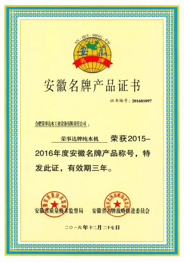 日前,安徽省質量技術監督局、安徽省名牌戰略推進委員會正式公示2015-2016年度安徽名牌產品榜單,合肥榮事達水工業設備有限責任公司申報的“榮事達牌純水機”產品榮列榜中,成為安徽凈水行業首家榮獲省級“名牌產品”稱號的企業,榮事達水工業公司強勁實力再次獲得政府和社會的充分肯定。