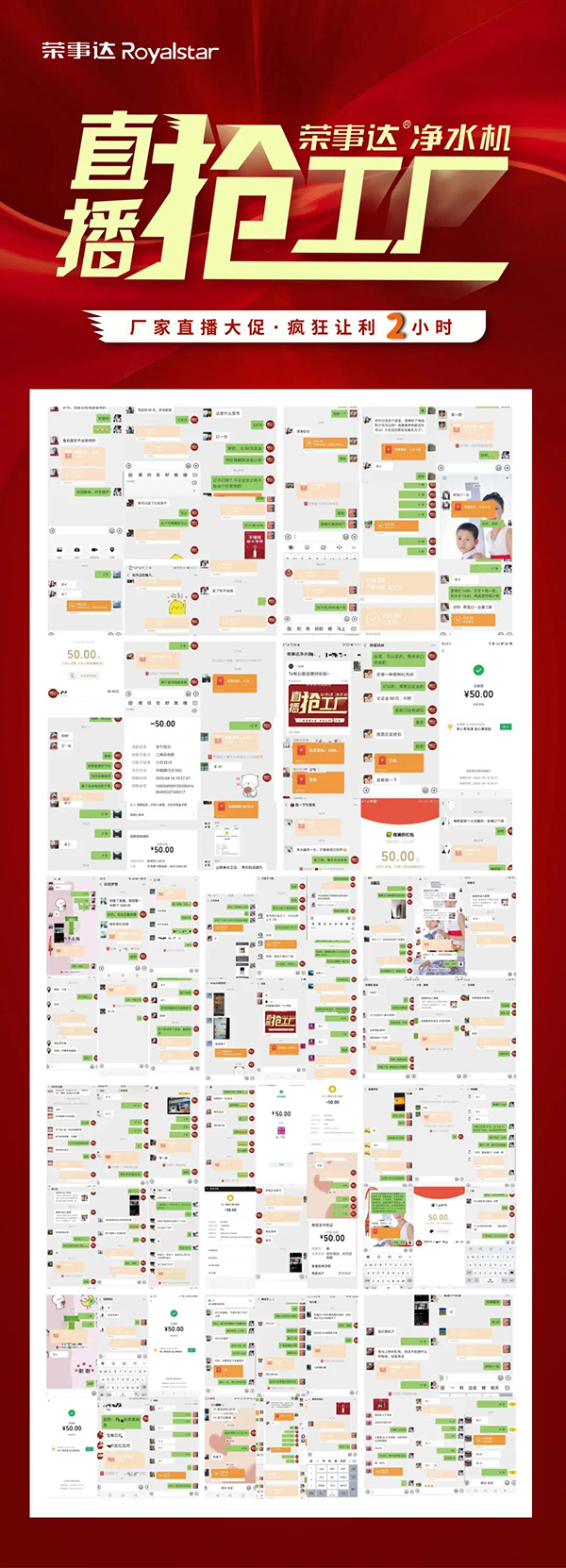 瞄準網絡化營銷聚變新格局,榮事達水工業集團以創新思維持續引領凈水銷售模式升級,借力現場感與代入感超強的新媒體直播平臺,貫通線上線下渠道,助力經銷商快速銷售。4月16日,榮事達2020年硬核大動作——“榮事達凈水機?直播搶工廠”網絡直播營銷活動強勢落地,贏戰市場!