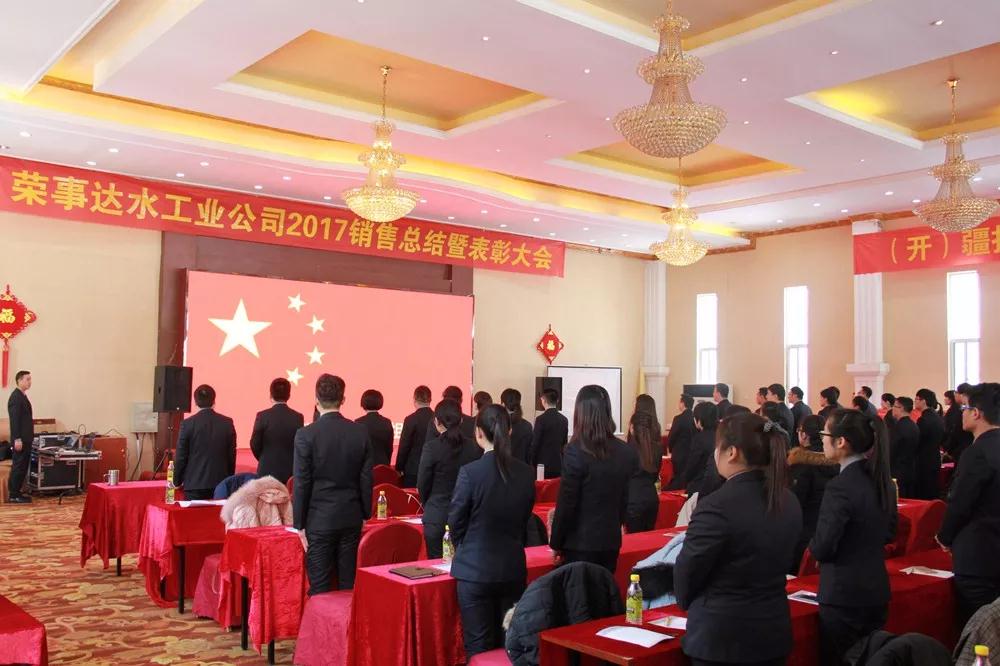 大會(huì)開場(chǎng),榮事達(dá)水工業(yè)公司銷售精英起立合唱《歌唱祖國(guó)》,唱響健康中國(guó)夢(mèng),歌唱屬于自己的凱歌,洪亮的歌聲拉開了“榮事達(dá)水工業(yè)公司2017銷售總結(jié)暨表彰大會(huì)”帷幕。