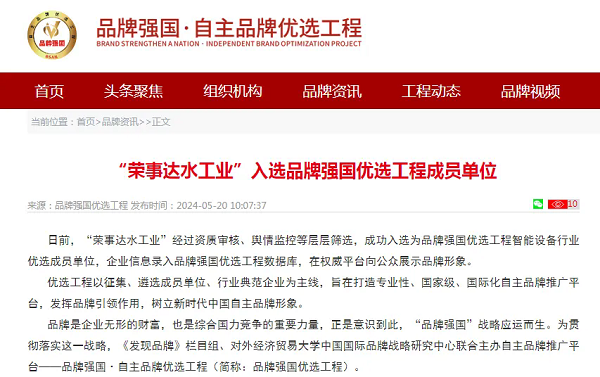 “榮事達水工業”入選品牌強國優選工程成員單位